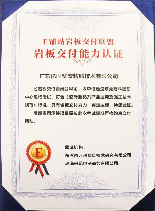 近日,广东亿固壁安粘贴技术有限公司荣获东莞市万科建筑技术研究有限公司、珠海采筑电子商务有限公司联合颁发的“岩板交付能力认证”证书,且“E铺贴”岩板交付联盟判定亿固具有岩板交付能力。